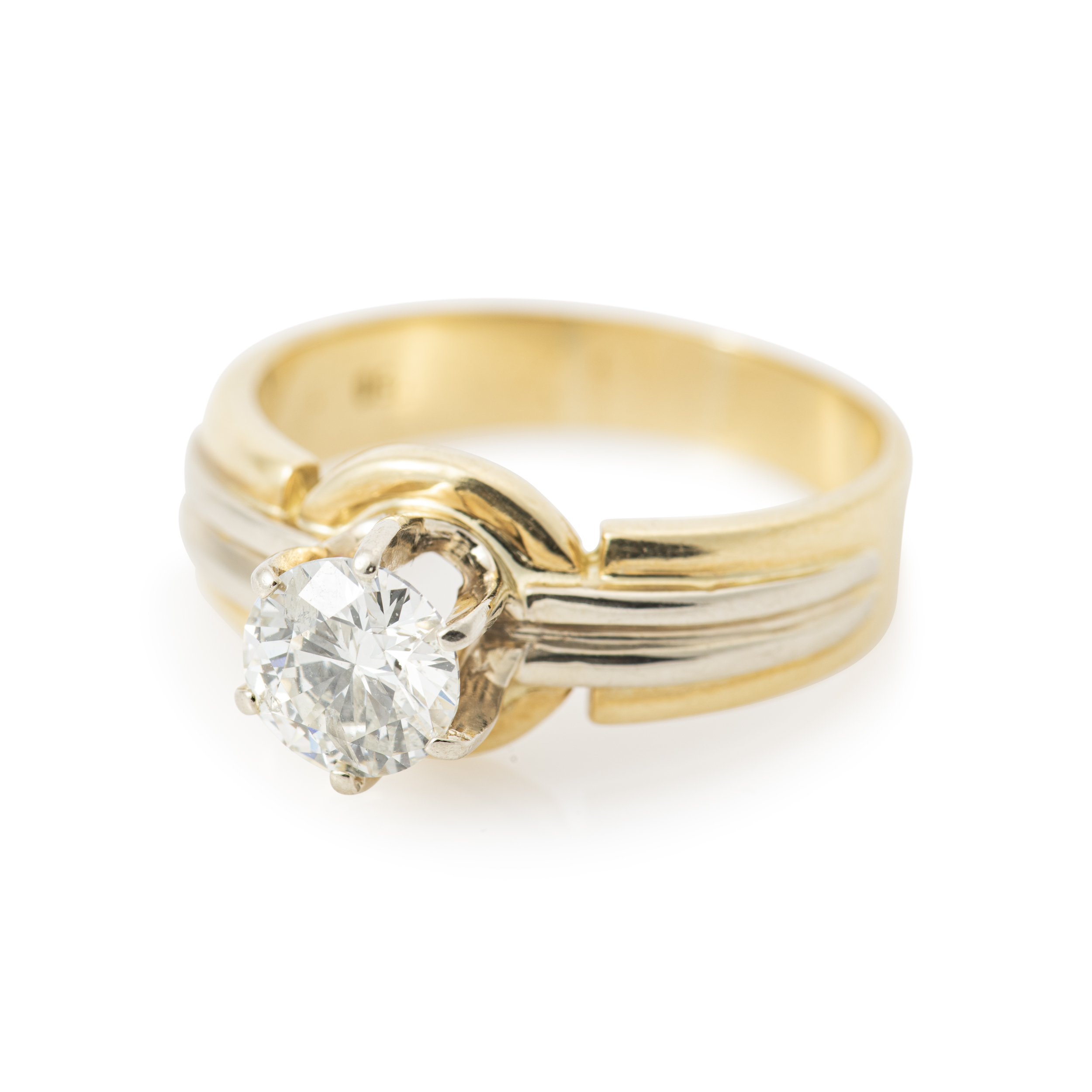 A diamond ring solitaire ring central set with a brilliant-cut diamond to a 18k yellow gold mount with white gold decoration Dutch assay mark c. 7.1 gr. (weight); ring size 60; diamond: c. 1.10 ct. clarity P, colour H-I